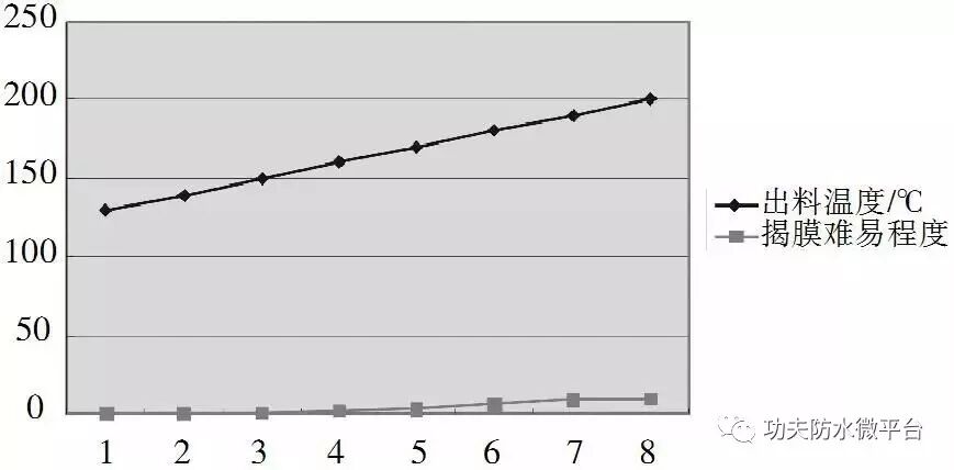 自粘卷材在生产时如果揭不开膜,受胶料的出料温度影响很大。如果温度超过160℃,PE隔离膜上的硅油会跟自粘胶料中的油份互相溶解,失去了隔离性。那么到了施工工地更不好揭膜了。见图1揭膜难易程度跟出料温度的关系图(纵坐标代表生产时胶料的出料温度,横坐标代表揭膜的难易程度,难易程度从0-8作为标识,8代表最难揭,即揭不开。)